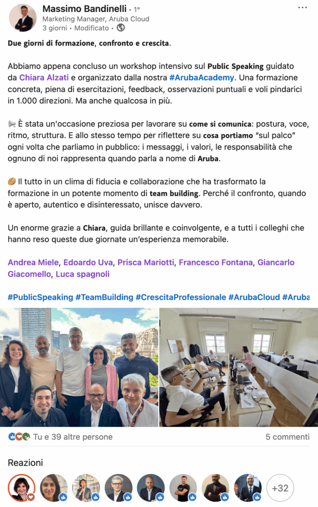Una delle prime sfide affrontate con i manager di Aruba è stata proprio questa: superare la convinzione che “ormai si è già detto tutto” o che ci sia un solo modo “corretto” per rappresentare l’azienda. In realtà, quando ho chiesto loro di ripartire da una passione personale, un valore sentito o un ricordo significativo, i discorsi hanno cambiato tono. Sono diventati più caldi, umani e riconoscibili. La persona dietro al ruolo è emersa. E con lei, un impatto completamente diverso sul pubblico.